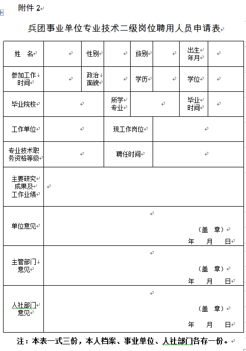1.申报聘任专业技术二级岗位时,需填写《兵团事业单位专业技术二级岗位聘用人员申请表》(一式三份,详见附件);