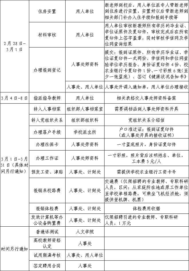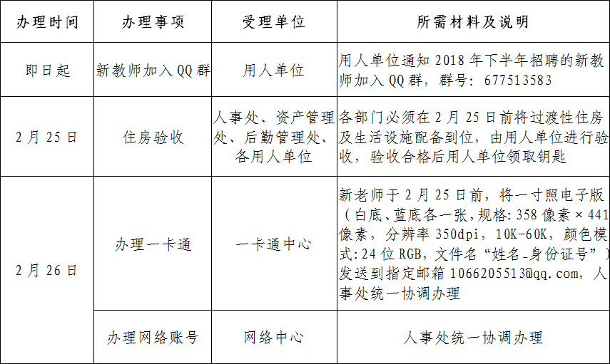 新教师必须按照规定时间来校报道,不得提前或晚到。来校前,应提前1天与用人单位取得联系,携带相关材料,由用人单位指派专人协助新教师按程序到受理单位办理相关手续。