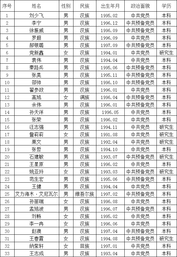 按照兵团事业单位公开招聘要求,我校2019年公开招聘辅导员工作通过报名、资格审查、笔试、面试、体检、考察等环节,最终确定33名拟聘用人员,现予以公示。