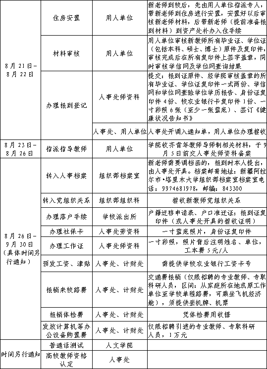 各单位要高度重视新教师报到安置工作,指定专人负责,提前做好住房分配、卧具配置、来校接待等安排,相关部门要通力配合,全面做好报到安置工作。