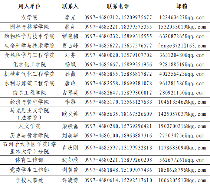 8.人事档案:应届毕业生在我校签订应届毕业生《就业协议书》后,由毕业学校将档案邮寄至学校档案室(邮寄地址:新疆阿拉尔市塔里木大学档案室(843300);邮寄方式:机要或EMS专用快递;收件人:袁林,电话:15739297448;在职人员联系所在学院开具《调档函》,到人事处盖章后,到原档案管理机构办理档案转移手续。